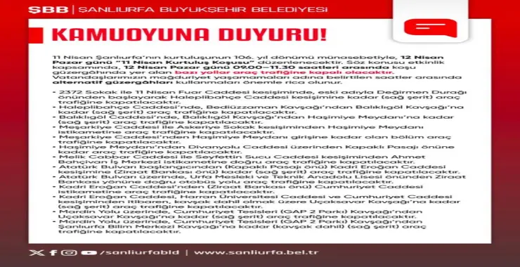 Koşu kapsamında kapanan yollar ve alternatif güzergahlar belirlendi. Şanlıurfa Büyükşehir Belediyesi sosyal medya hesaplarından koşu güzergahı ve alternatif yolları paylaştı.