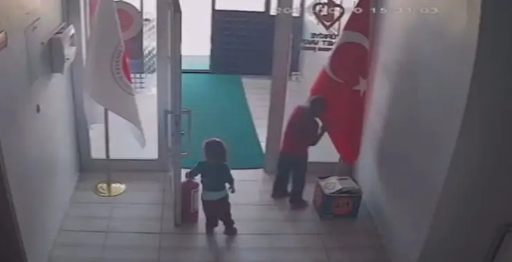 Ceylanpınar İlçe Müftülüğü hizmet binasının girişinde bulunan Türk bayrağına sevgiyle yaklaşan 7 yaşındaki Dilek Debe ve 3 yaşındaki kardeşi Reyhan Debe’nin davranışları güvenlik kamerasına yansıdı.