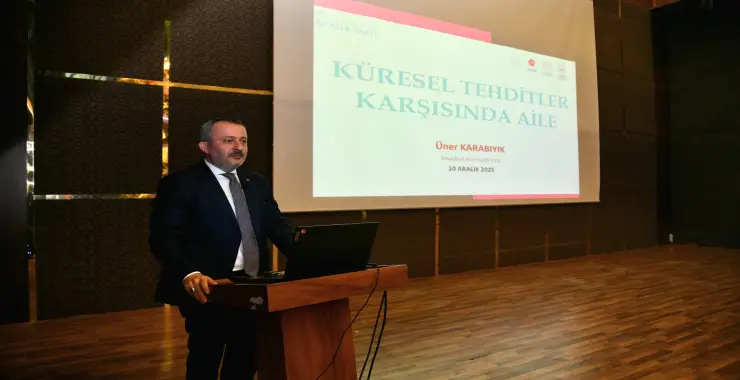 Onikiler Öğretmenevinde düzenlenen aile temalı konferansta İstanbul Aile Vakfı Yönetim Kurulu Başkanı Üner Karabıyık, küresel tehditler karşısında ailenin önemine değindi.