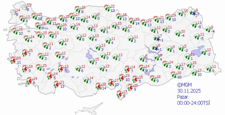 Meteoroloji verilerine göre Marmara’nın güney ve doğusu, Ege, Akdeniz, İç Anadolu, Batı Karadeniz, Orta ve Doğu Karadeniz’in iç kesimleri, Doğu Anadolu, Güneydoğu Anadolu ile Samsun çevrelerinin yağışlı geçeceği tahmin ediliyor.