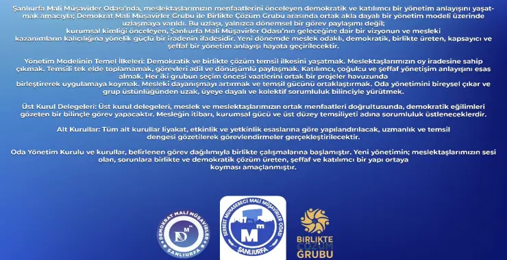 Şanlıurfa Serbest Muhasebeci ve Mali Müşavirler Odası seçimleri sonrasında  en çok oy alan 3 grup arasında ortaya çıkan anlaşmazlık çözüldü.